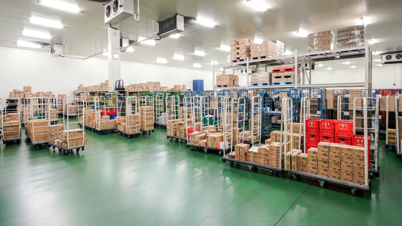 千葉県八街市に保有する低温物流センターでは、冷蔵品と冷凍品の両方を同一のセンター内で管理しています。在庫をすべて自社管理しているため、小ロットでのきめ細やかな配送も可能。コストを抑えながら、多様化する消費者ニーズに柔軟に対応できる配送体制を実現しています。